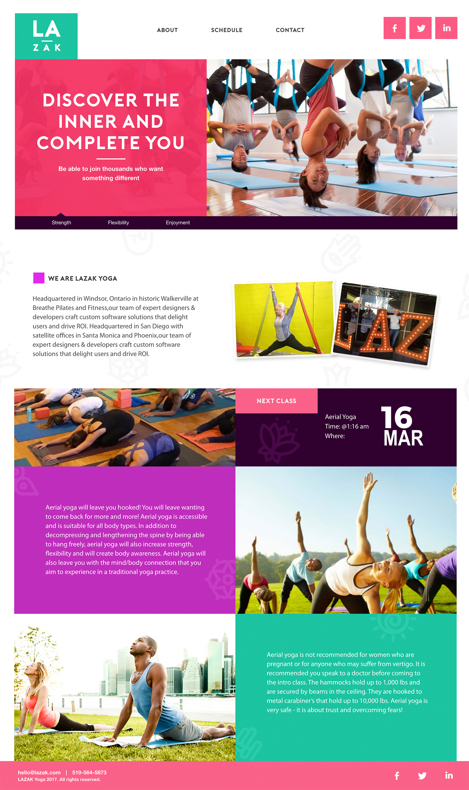 LA Zak primarily focuses on aerial yoga. Aerial yoga enables you to practice traditional yoga poses with aerial adaptations. These adaptions often give you more flexibility, strength and focus than traditional yoga as you have the benefit of a prop to support you. LA Zak is located in Windsor, Ontario in historic Walkerville at Breathe Pilates and Fitness.